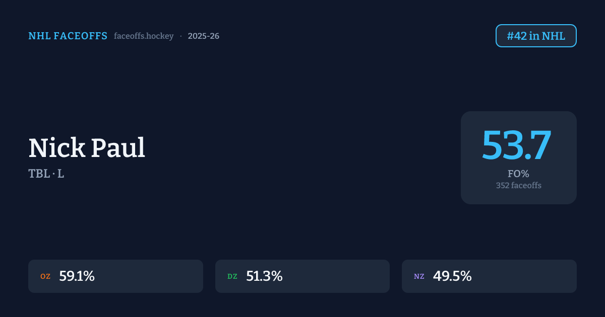 Nick Paul has a 2025-26 faceoff win percentage of 53.7% across 352 faceoffs in the 2025-26 season. Best zone: Offensive (59.1%). Ranked #42 in the league.