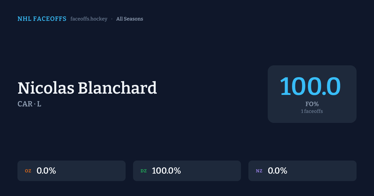 Nicolas Blanchard has a career faceoff win percentage of 100.0% across 1 faceoffs. Best zone: Defensive (100.0%).