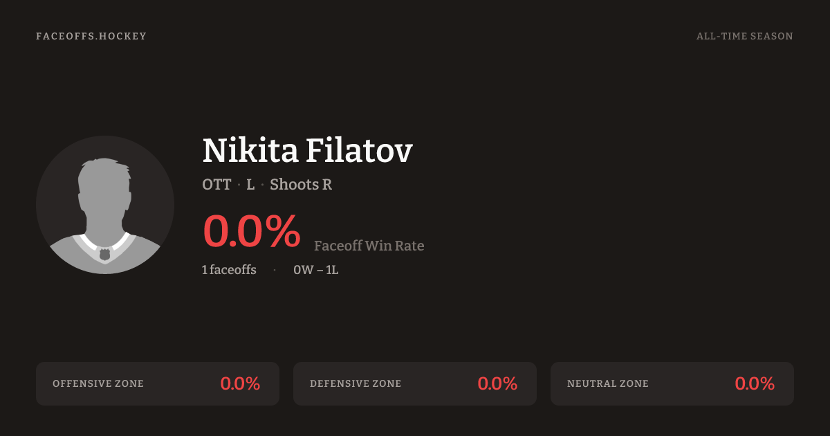 Nikita Filatov has a career faceoff win percentage of 0.0% across 1 faceoffs. Best zone: Neutral (0.0%).