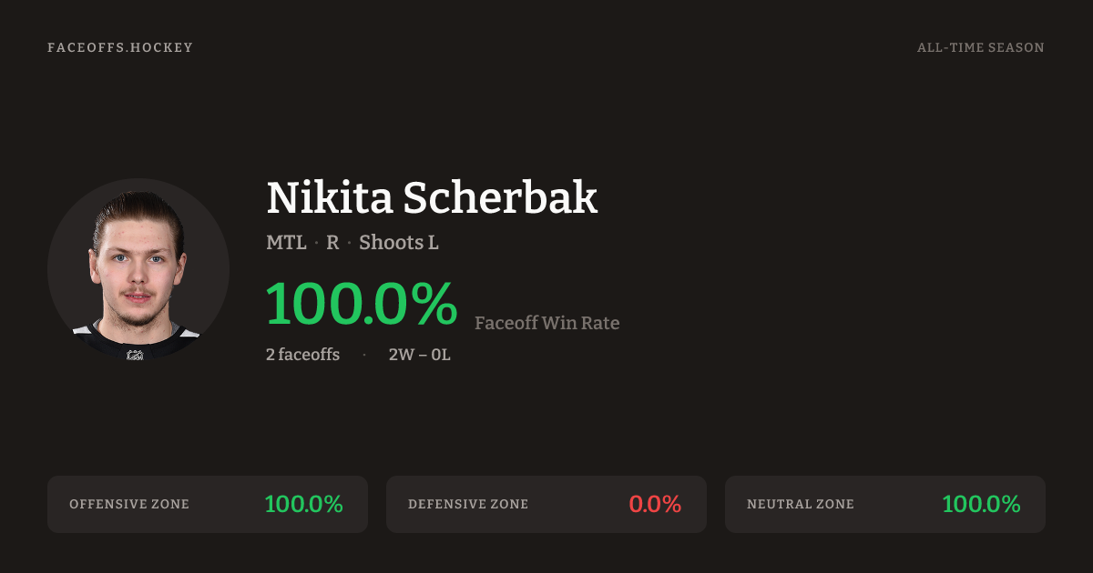 Nikita Scherbak has a 2017-18 faceoff win percentage of 100.0% across 2 faceoffs in the 2017-18 season. Best zone: Neutral (100.0%).