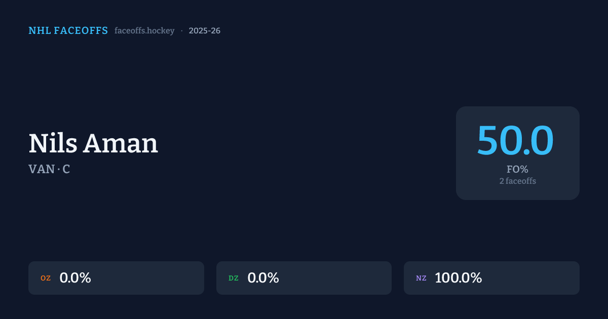 Nils Aman has a 2025-26 faceoff win percentage of 50.0% across 2 faceoffs in the 2025-26 season. Best zone: Neutral (100.0%).