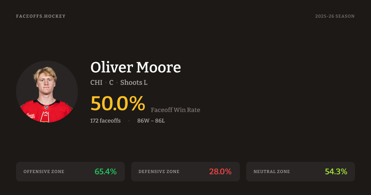 Oliver Moore has a career faceoff win percentage of 48.4% across 192 faceoffs. Best zone: Offensive (60.7%).