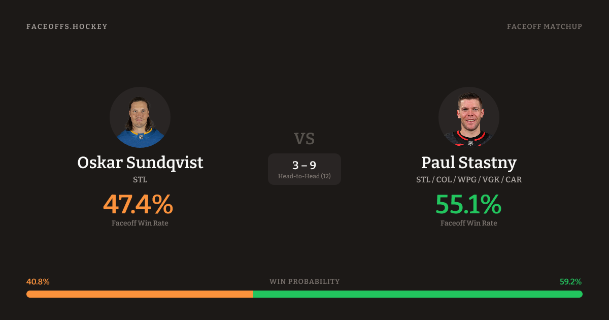 Paul Stastny holds a +12.7% FO% edge overall. Look for Stastny on offensive-zone draws (67% H2H, 6 meetings). Sundqvist wins 41.0% vs left-shot opponents — Stastny shoots left.
