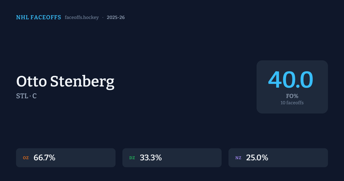 Otto Stenberg has a 2025-26 faceoff win percentage of 40.0% across 10 faceoffs in the 2025-26 season. Best zone: Offensive (66.7%).