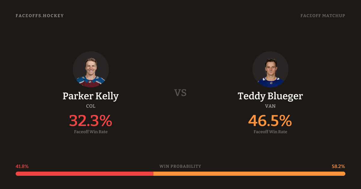 Teddy Blueger holds a +7.2% FO% edge overall. Look for Blueger on offensive-zone draws (67% H2H, 3 meetings). Kelly wins 43.9% vs left-shot opponents — Blueger shoots left.