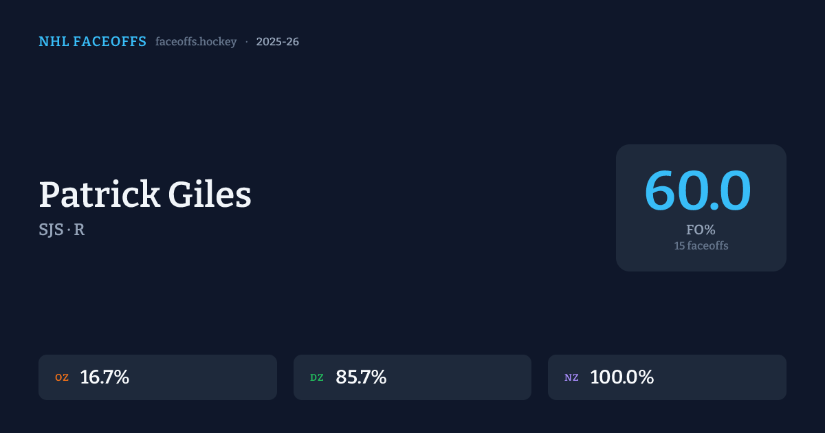 Patrick Giles has a 2024-25 faceoff win percentage of 34.0% across 97 faceoffs in the 2024-25 season. Best zone: Defensive (40.0%).