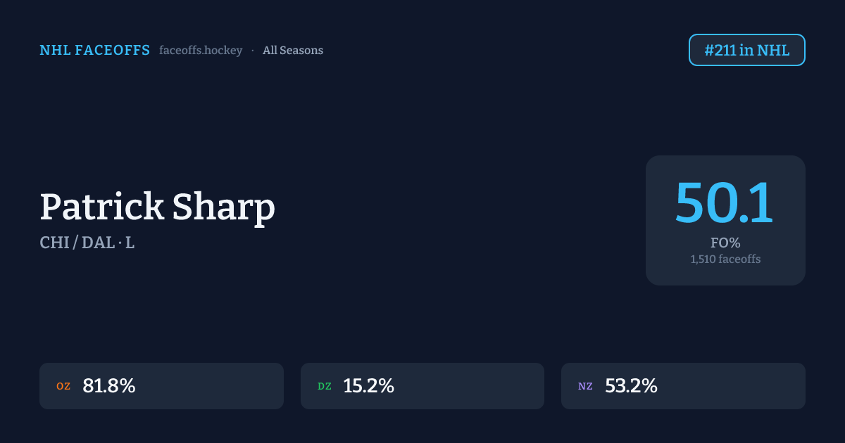 Patrick Sharp has a career faceoff win percentage of 50.1% across 1,510 faceoffs. Best zone: Offensive (81.8%). Ranked #211 in the league.