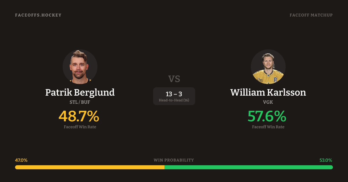 William Karlsson holds a +2.6% FO% edge overall. Look for Berglund on neutral-zone draws (100% H2H, 6 meetings).