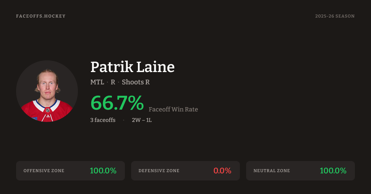 Patrik Laine has a 2025-26 faceoff win percentage of 66.7% across 3 faceoffs in the 2025-26 season. Best zone: Neutral (100.0%).