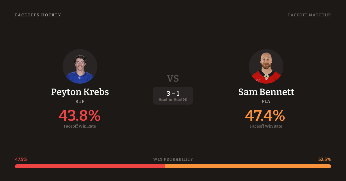 Sam Bennett holds a +1.3% FO% edge overall. Look for Krebs on defensive-zone draws (88% H2H, 8 meetings). Krebs wins 44.0% vs left-shot opponents — Bennett shoots left.