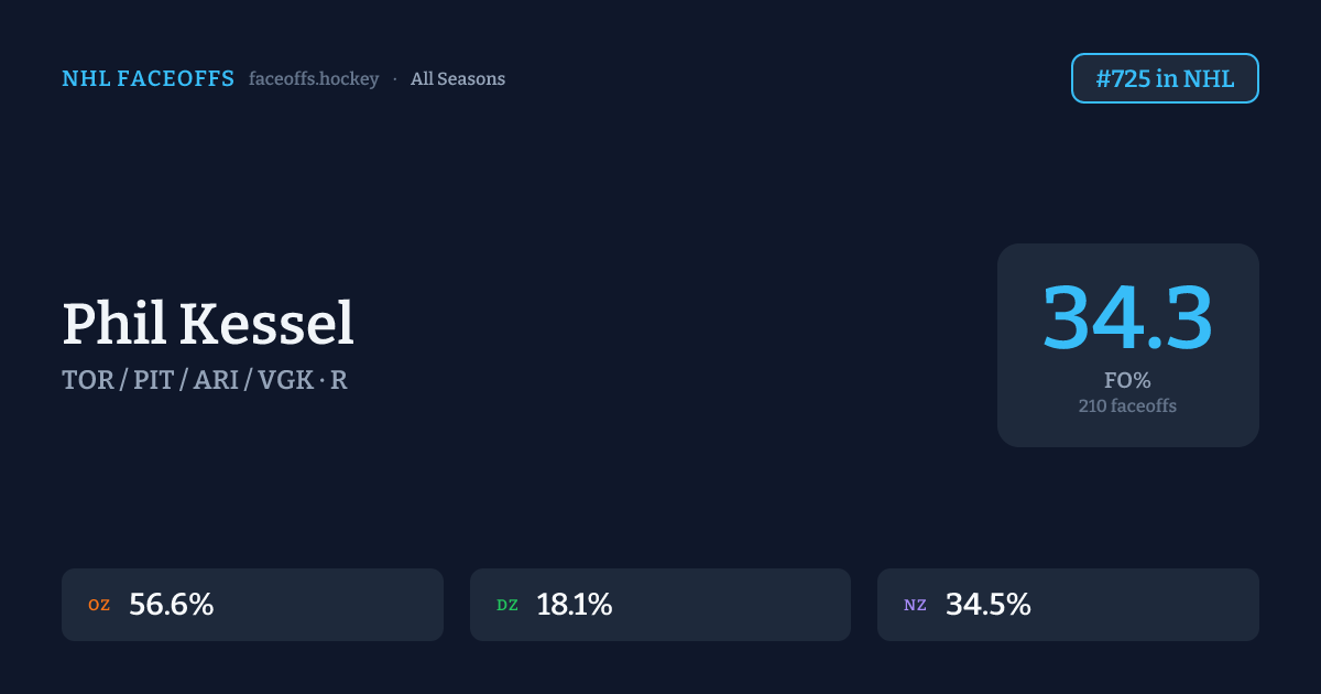 Phil Kessel has a career faceoff win percentage of 34.3% across 210 faceoffs. Best zone: Offensive (56.6%). Ranked #725 in the league.