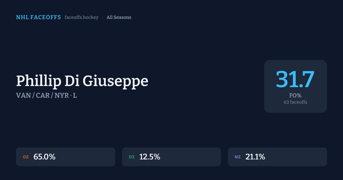 Phillip Di Giuseppe has a 2016-17 faceoff win percentage of 0.0% across 2 faceoffs in the 2016-17 season. Best zone: Neutral (0.0%).