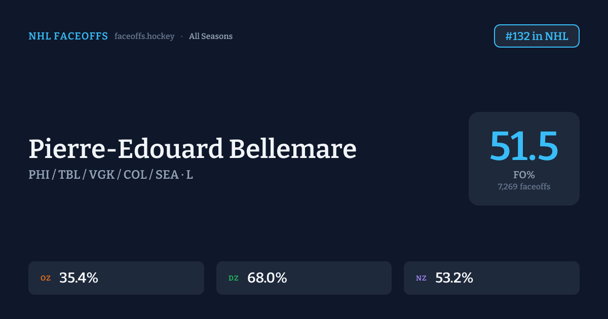 Pierre-Edouard Bellemare has a 2022-23 faceoff win percentage of 53.0% across 679 faceoffs in the 2022-23 season. Best zone: Defensive (63.7%). Ranked #47 in the league.
