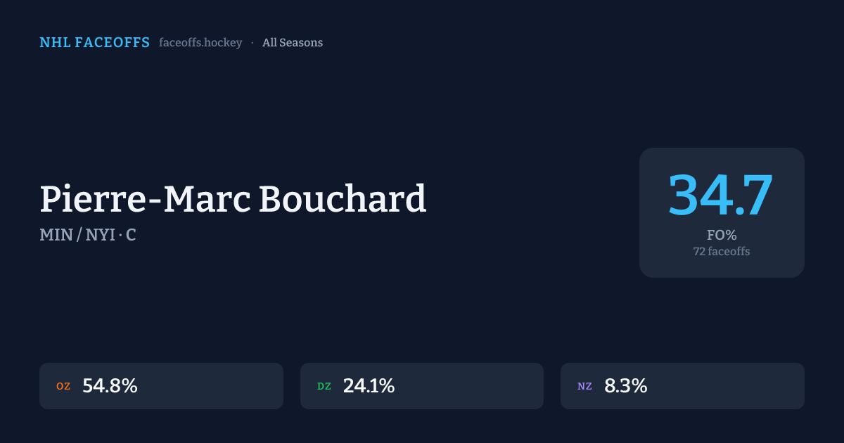 Pierre-Marc Bouchard has a 2013-14 faceoff win percentage of 60.0% across 5 faceoffs in the 2013-14 season. Best zone: Defensive (66.7%).
