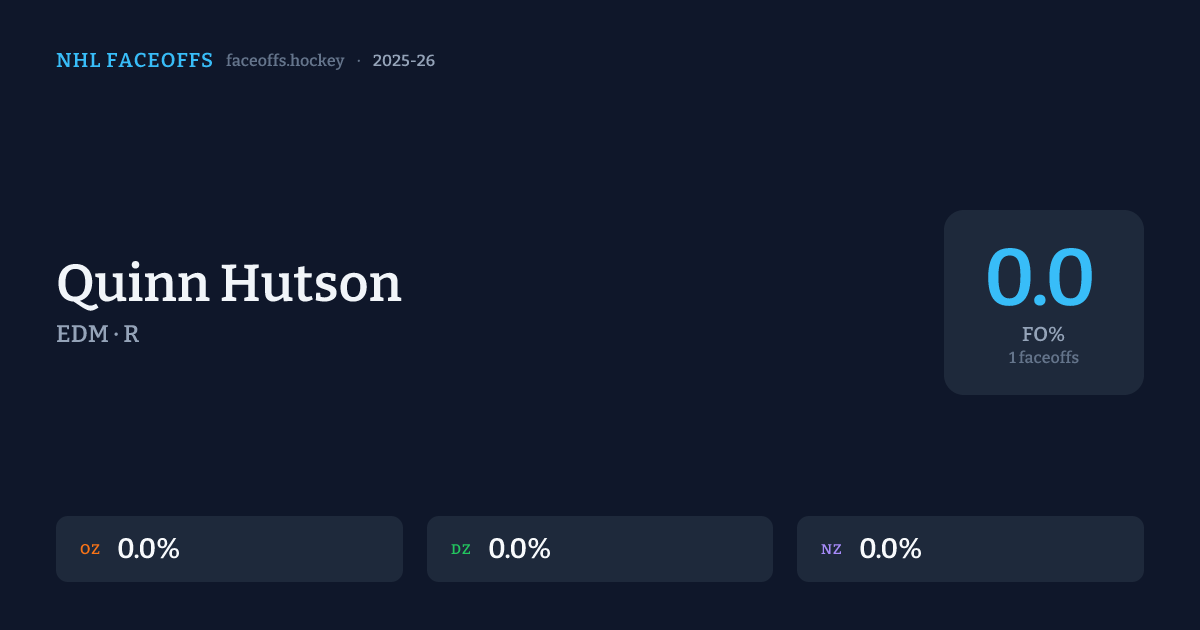 Quinn Hutson has a 2025-26 faceoff win percentage of 0.0% across 1 faceoffs in the 2025-26 season. Best zone: Neutral (0.0%).