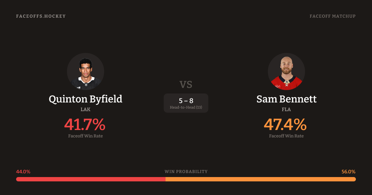 Sam Bennett holds a +3.5% FO% edge overall. Look for Byfield on offensive-zone draws (57% H2H, 7 meetings). Byfield wins 43.3% vs left-shot opponents — Bennett shoots left.