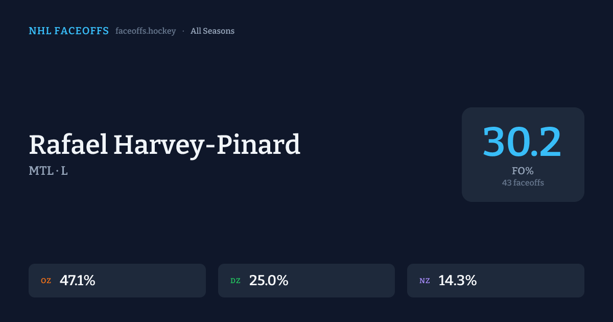 Rafael Harvey-Pinard has a 2022-23 faceoff win percentage of 0.0% across 1 faceoffs in the 2022-23 season. Best zone: Neutral (0.0%).