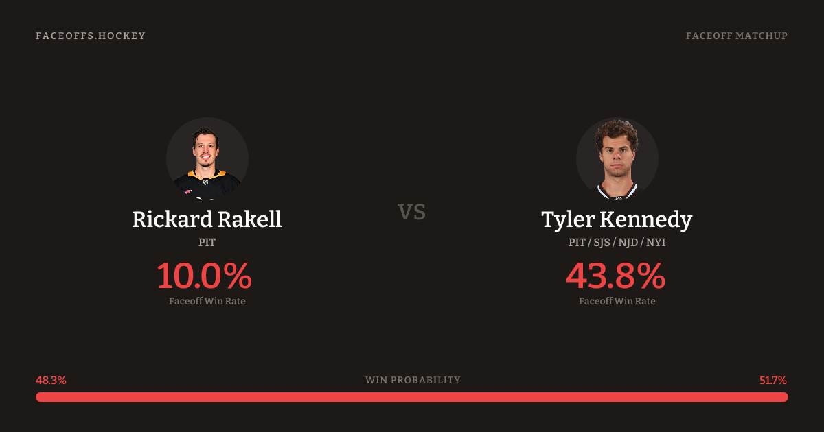 Rickard Rakell holds a +1.2% FO% edge overall. Rakell wins 45.0% vs right-shot opponents — Kennedy shoots right.