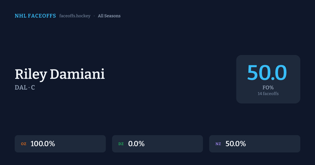 Riley Damiani has a career faceoff win percentage of 50.0% across 14 faceoffs. Best zone: Offensive (100.0%).