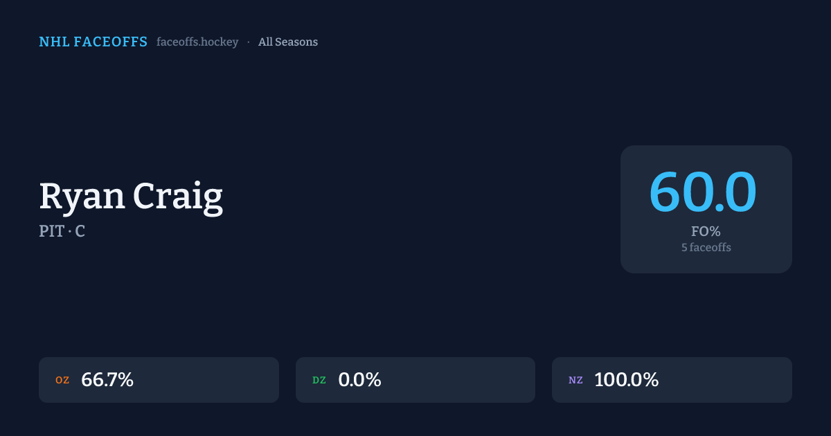 Ryan Craig has a career faceoff win percentage of 60.0% across 5 faceoffs. Best zone: Neutral (100.0%).