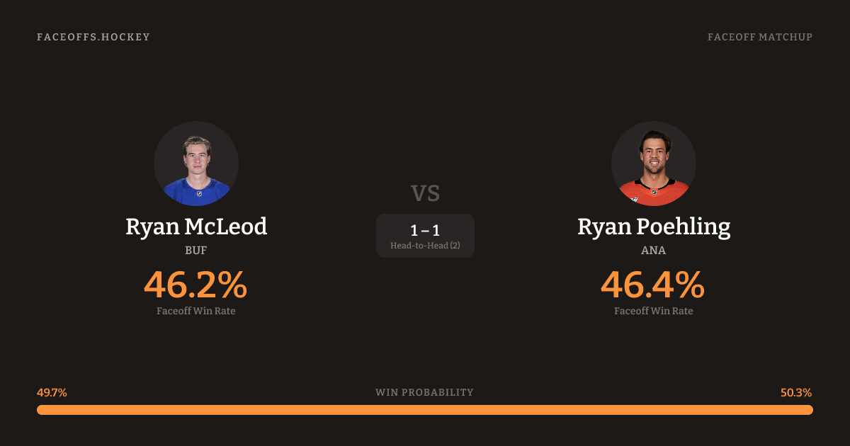 Ryan McLeod holds a +1.4% FO% edge overall. Look for McLeod on offensive-zone draws (80% H2H, 5 meetings).