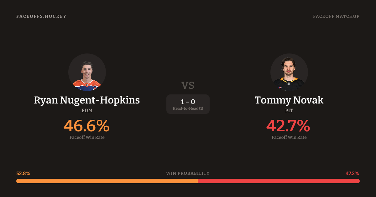 Ryan Nugent-Hopkins holds a +5.8% FO% edge overall. Look for Nugent-Hopkins on defensive-zone draws (100% H2H, 4 meetings).