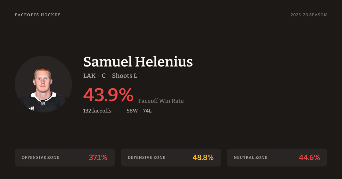 Samuel Helenius has a 2025-26 faceoff win percentage of 44.4% across 124 faceoffs in the 2025-26 season. Best zone: Defensive (48.6%).