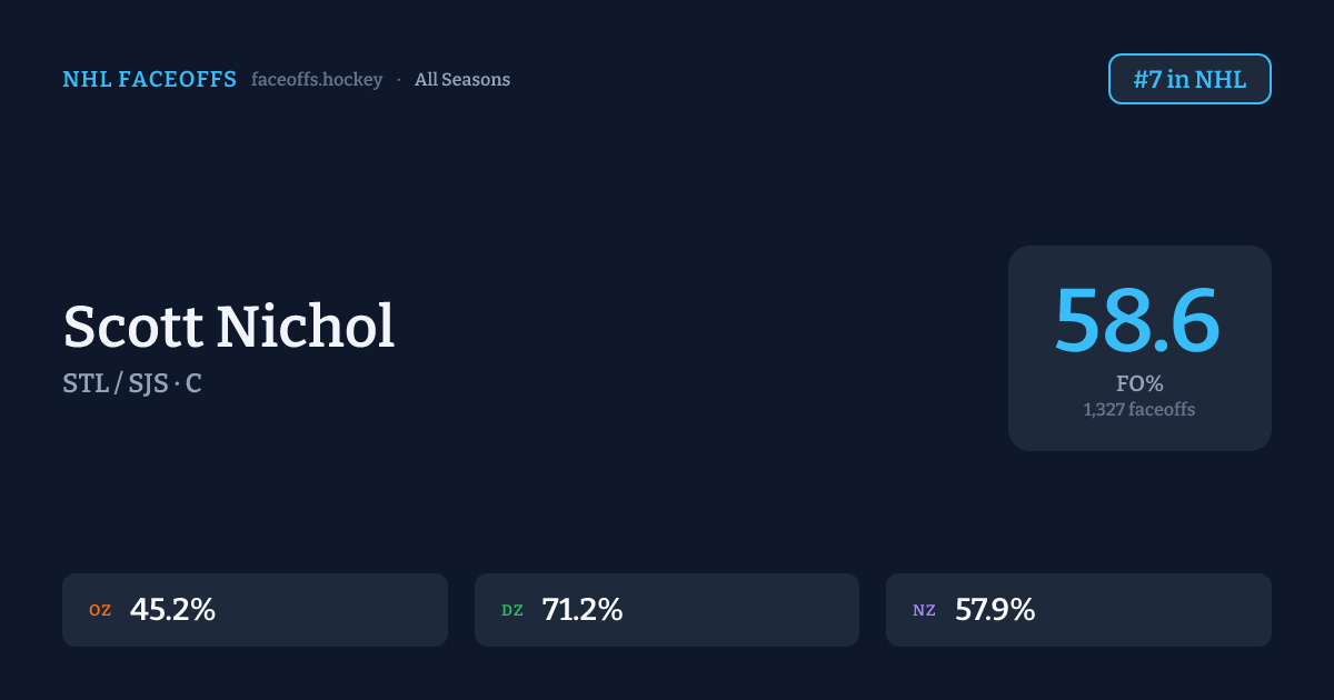 Scott Nichol has a career faceoff win percentage of 58.6% across 1,327 faceoffs. Best zone: Defensive (71.2%). Ranked #7 in the league.