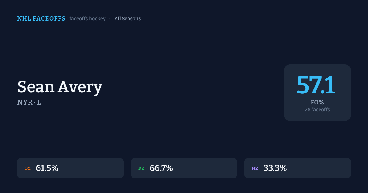Sean Avery has a career faceoff win percentage of 57.1% across 28 faceoffs. Best zone: Defensive (66.7%).