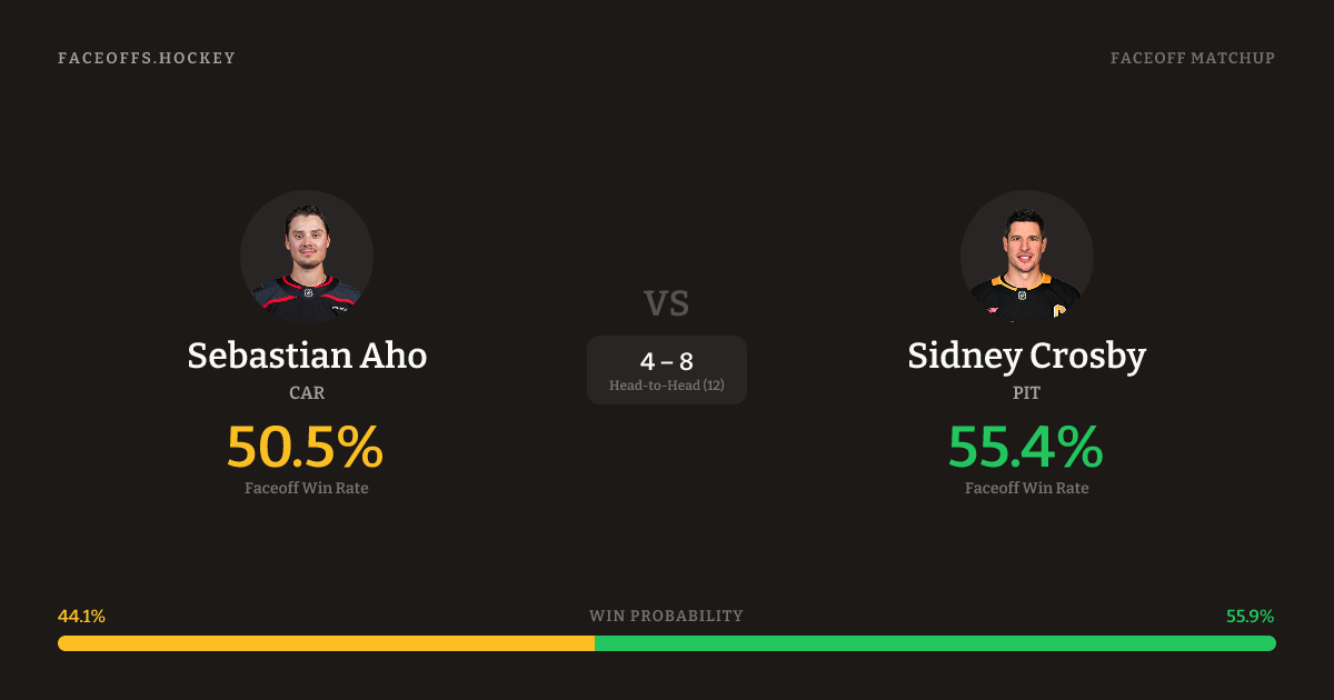 Sidney Crosby holds a +4.9% FO% edge overall. Look for Crosby on offensive-zone draws (71% H2H, 7 meetings).