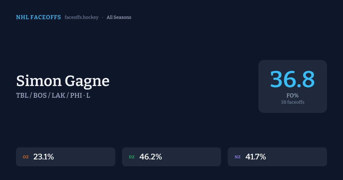 Simon Gagne has a 2012-13 faceoff win percentage of 100.0% across 2 faceoffs in the 2012-13 season. Best zone: Neutral (100.0%).