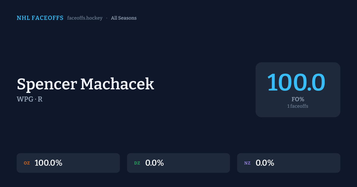 Spencer Machacek has a 2011-12 faceoff win percentage of 100.0% across 1 faceoffs in the 2011-12 season. Best zone: Offensive (100.0%).