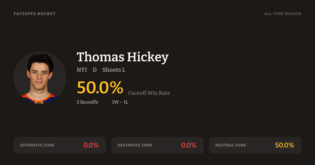 Thomas Hickey has a career faceoff win percentage of 50.0% across 2 faceoffs. Best zone: Neutral (50.0%).