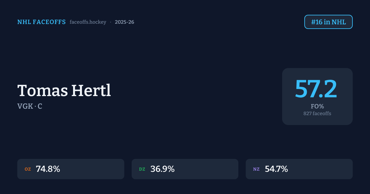 Tomas Hertl has a 2025-26 faceoff win percentage of 57.2% across 827 faceoffs in the 2025-26 season. Best zone: Offensive (74.8%). Ranked #16 in the league.