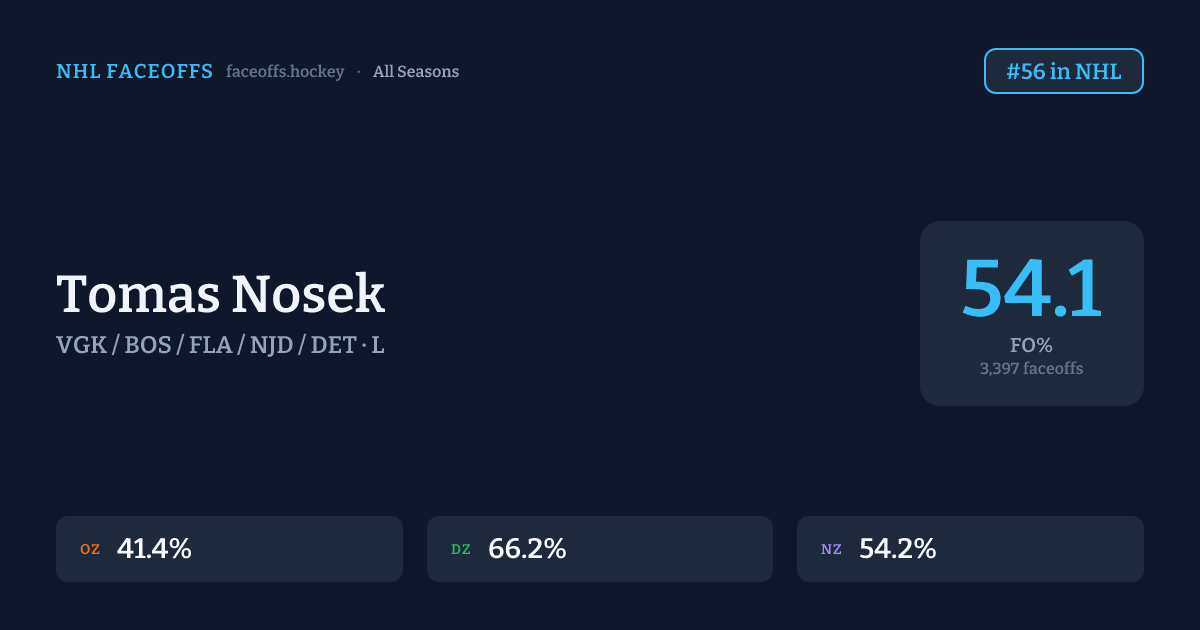 Tomas Nosek has a career faceoff win percentage of 54.1% across 3,397 faceoffs. Best zone: Defensive (66.2%). Ranked #56 in the league.