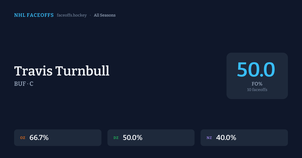 Travis Turnbull has a 2011-12 faceoff win percentage of 50.0% across 10 faceoffs in the 2011-12 season. Best zone: Offensive (66.7%).