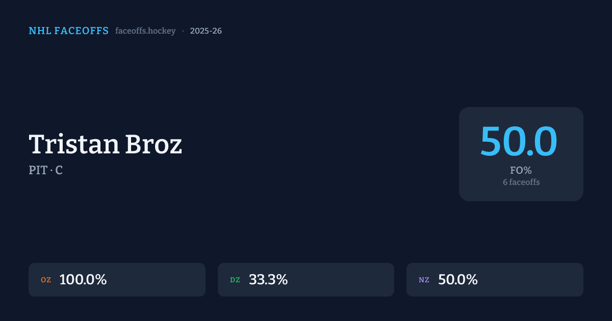 Tristan Broz has a 2025-26 faceoff win percentage of 50.0% across 6 faceoffs in the 2025-26 season. Best zone: Offensive (100.0%).