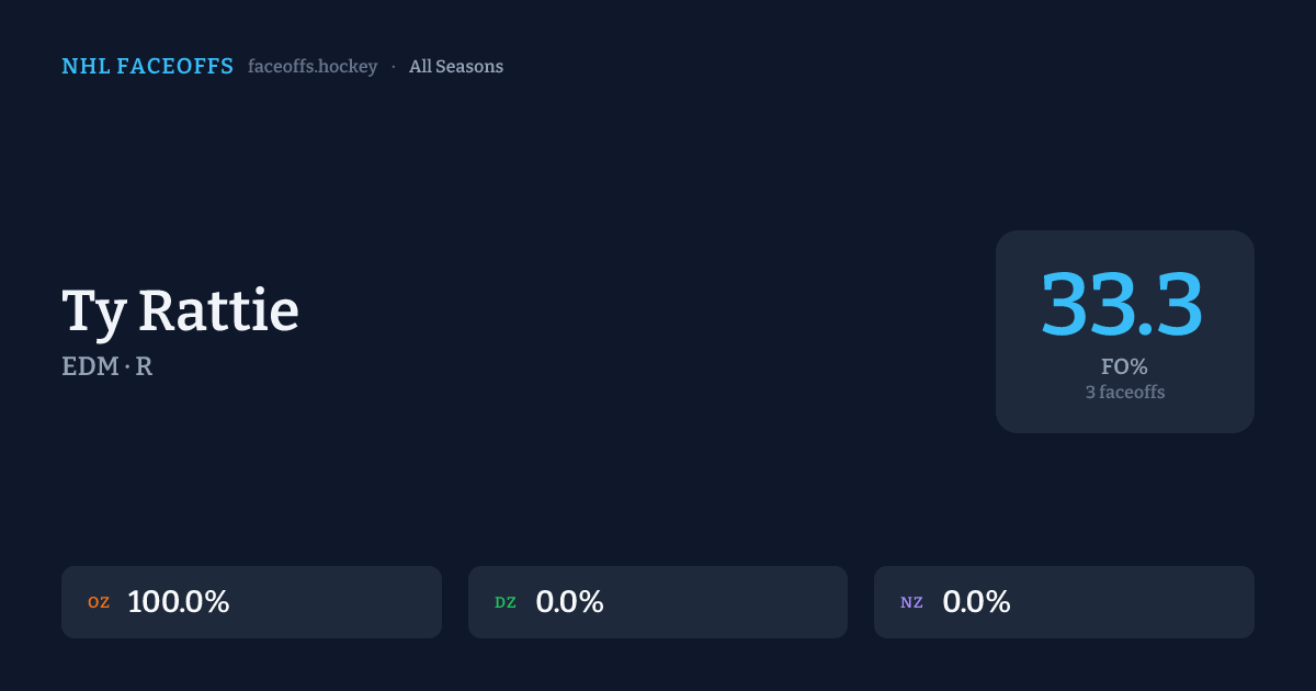 Ty Rattie has a 2018-19 faceoff win percentage of 33.3% across 3 faceoffs in the 2018-19 season. Best zone: Offensive (100.0%).