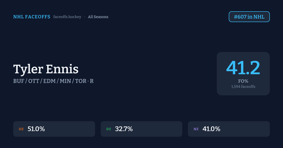 Tyler Ennis has a career faceoff win percentage of 41.2% across 1,594 faceoffs. Best zone: Offensive (51.0%). Ranked #607 in the league.