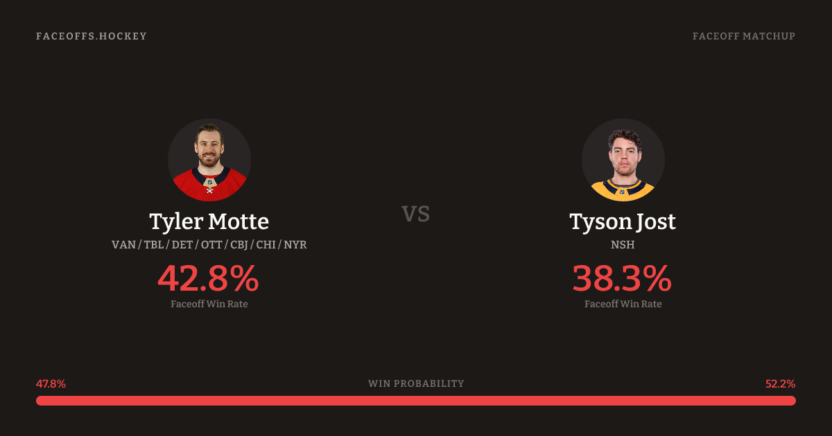 Tyler Motte holds a +2.7% FO% edge overall. Motte wins 42.8% vs left-shot opponents — Jost shoots left.