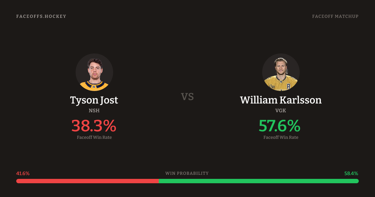 William Karlsson holds a +16.5% FO% edge overall. Look for Karlsson on offensive-zone draws (75% H2H, 4 meetings). Jost wins 38.5% vs left-shot opponents — Karlsson shoots left.