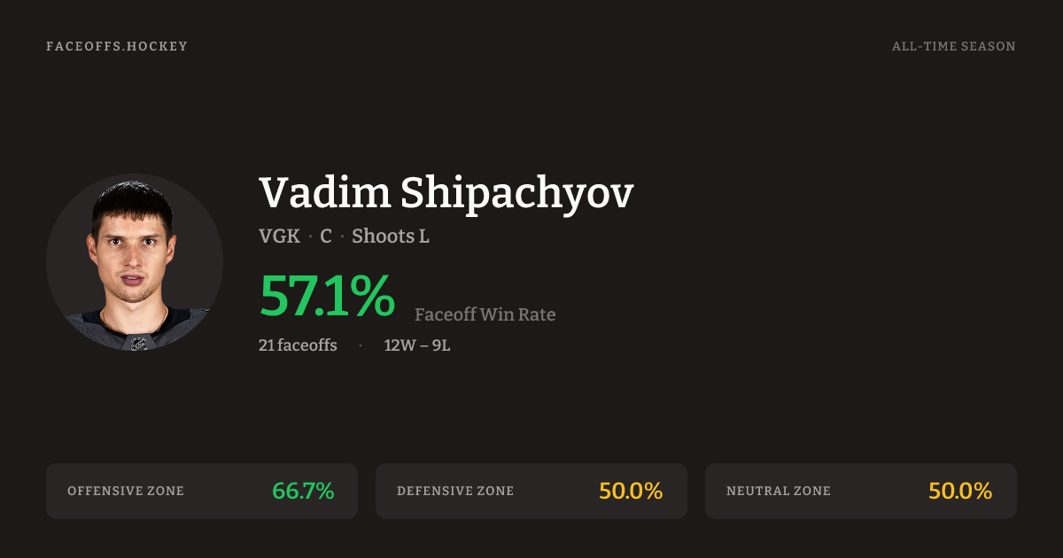 Vadim Shipachyov has a career faceoff win percentage of 57.1% across 21 faceoffs. Best zone: Offensive (66.7%).