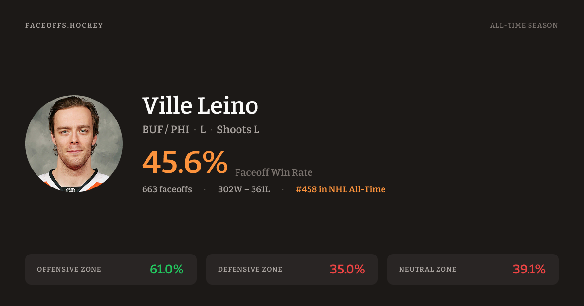 Ville Leino has a career faceoff win percentage of 45.1% across 697 faceoffs. Best zone: Offensive (62.4%). Ranked #474 in the league.