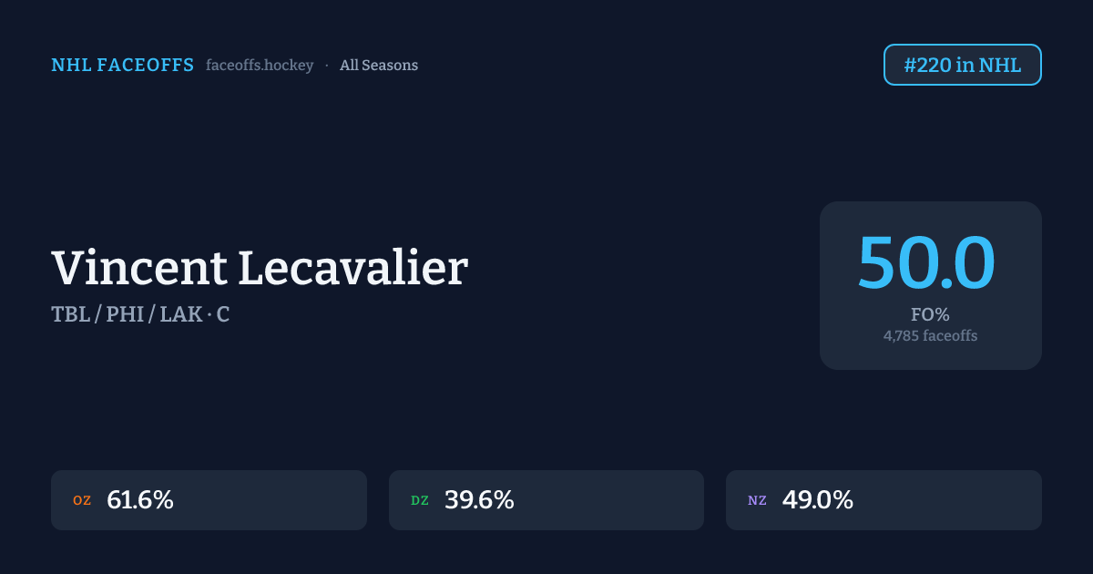 Vincent Lecavalier has a career faceoff win percentage of 50.0% across 4,785 faceoffs. Best zone: Offensive (61.6%). Ranked #220 in the league.