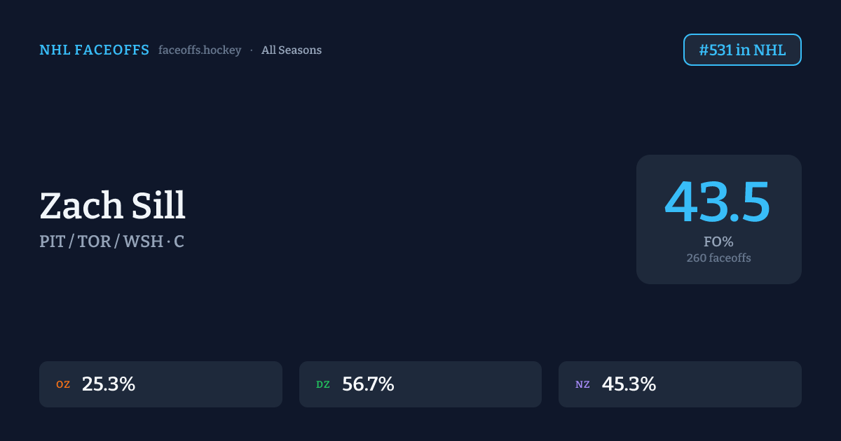Zach Sill has a career faceoff win percentage of 43.5% across 260 faceoffs. Best zone: Defensive (56.7%). Ranked #531 in the league.