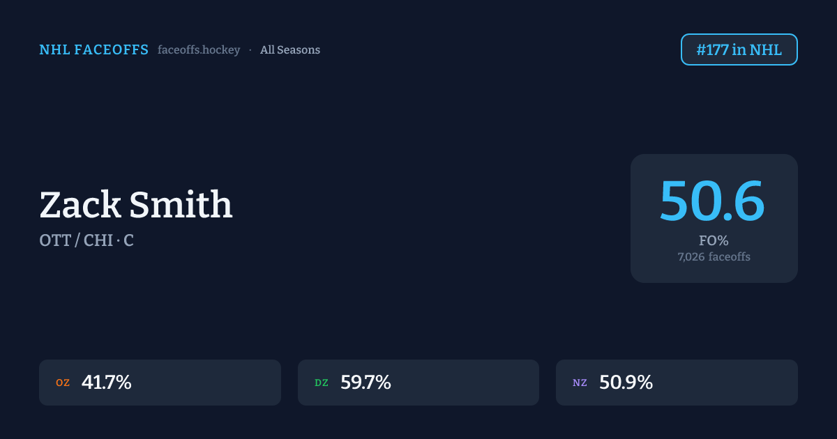 Zack Smith has a career faceoff win percentage of 50.6% across 7,026 faceoffs. Best zone: Defensive (59.7%). Ranked #177 in the league.