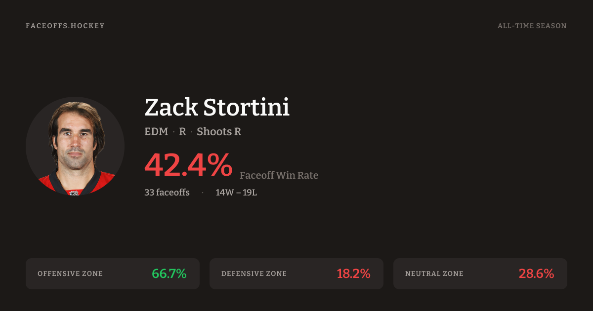 Zack Stortini has a career faceoff win percentage of 42.4% across 33 faceoffs. Best zone: Offensive (66.7%).